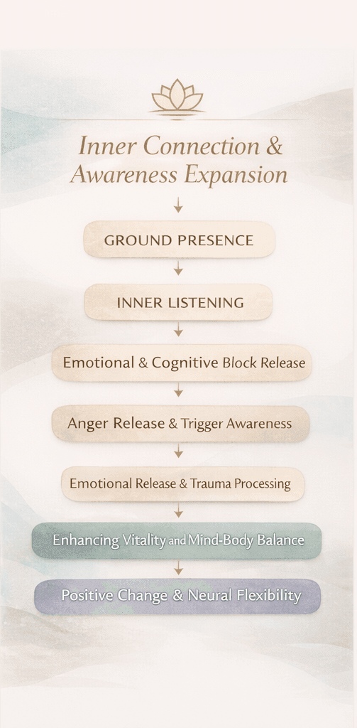 כל מפגש משלב תדרי שמע, שכבות סאונד אמביינט עדינות והרמוניות גבוהות המכוונות ליצירת סינכרון בין המוח לגוף ולחיזוק נוכחות פנימית, רוגע ויכולת קשב